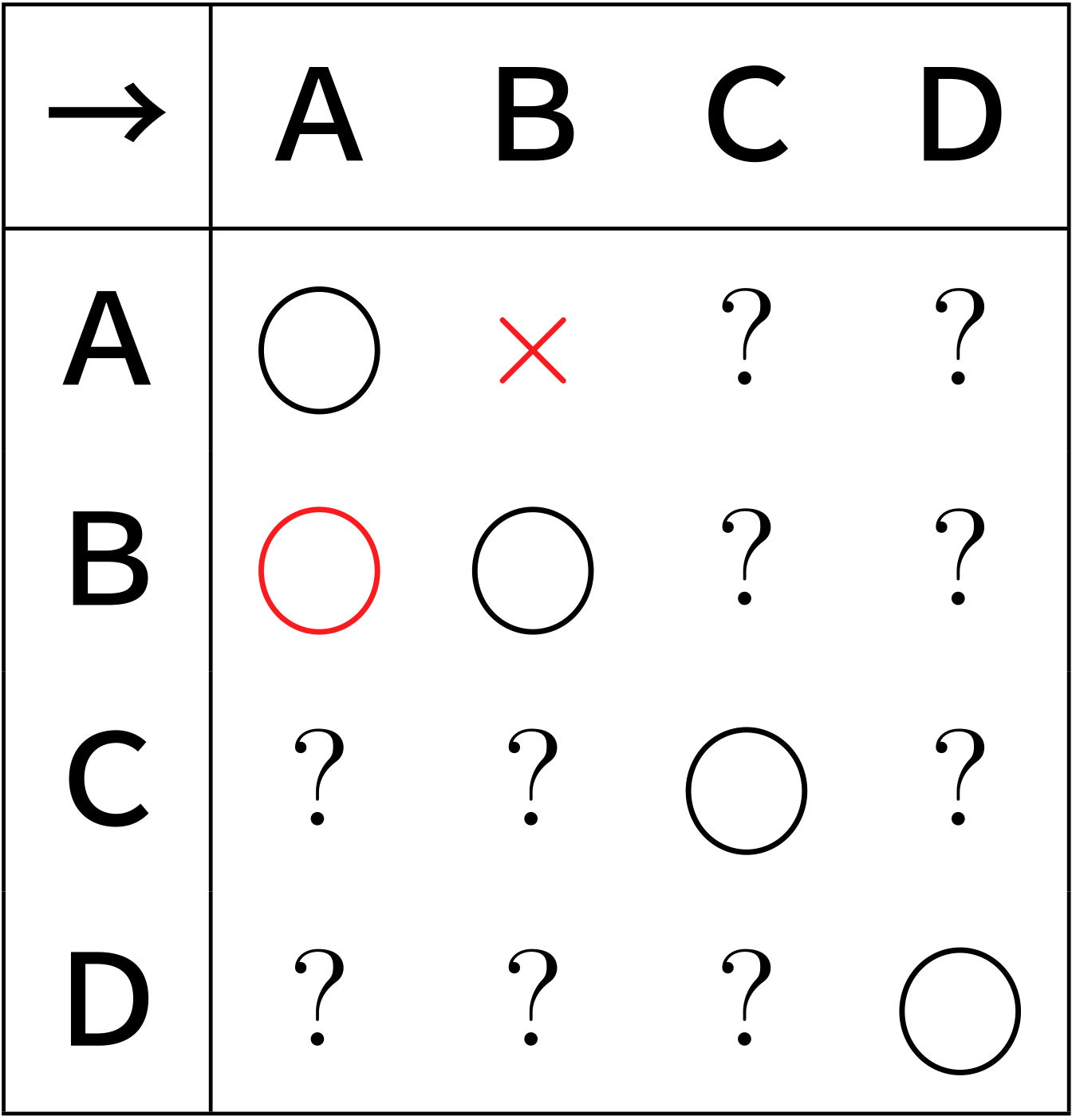 僕「第1試合ではAが勝ったので、B→Aが成り立つので○を入れて、 ボンスカのときの反省を活かして、A→Bが成り立たないので×を入れる。 そうすると表はこうなる」
