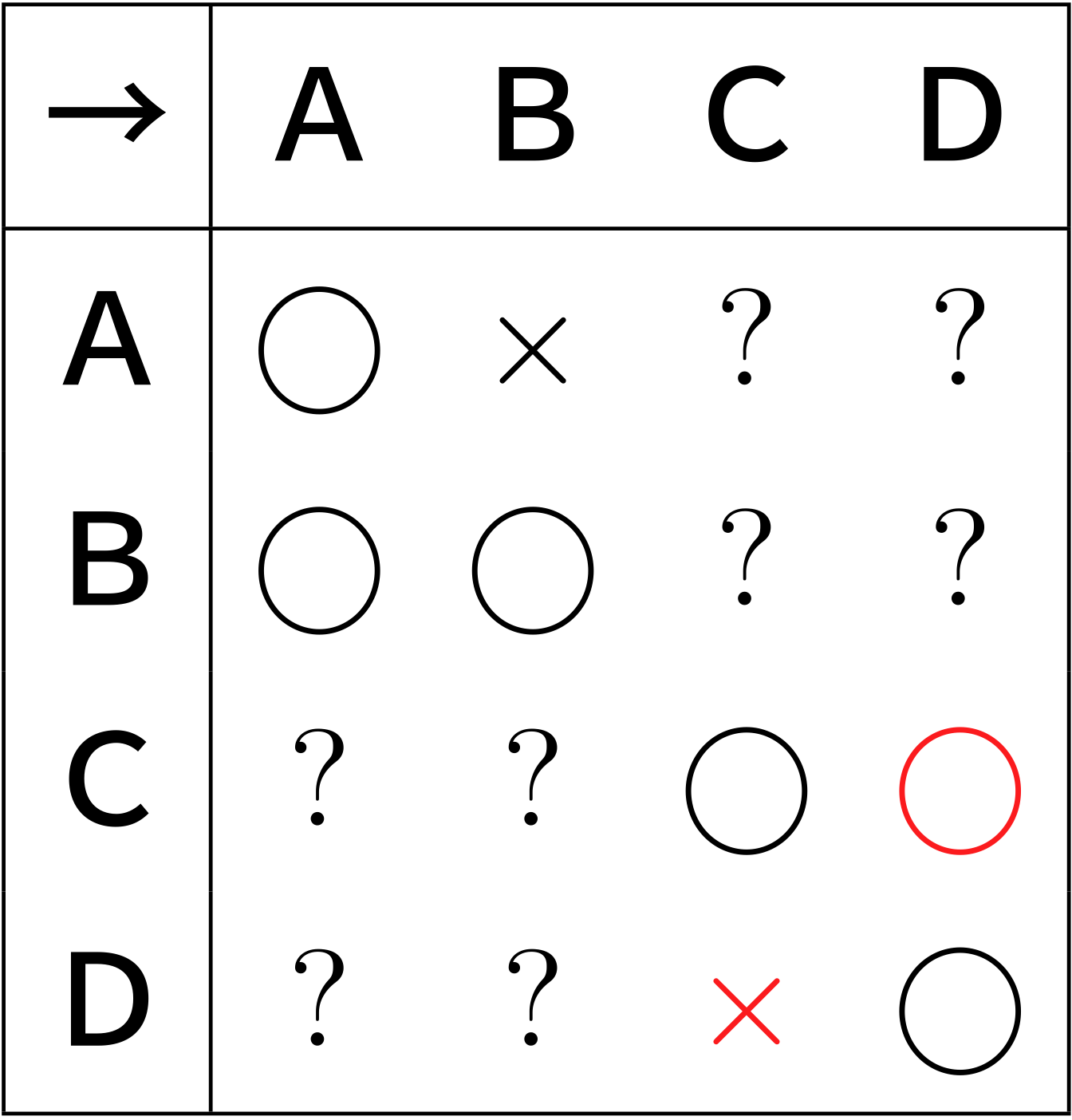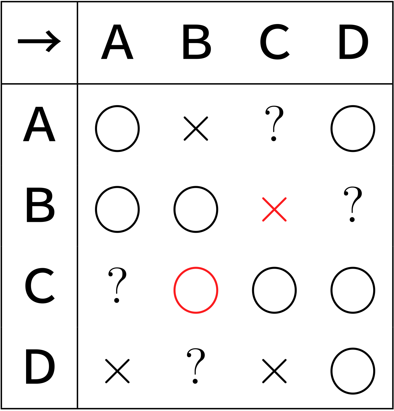 ※C→Dに○、D→Cに×を入れる。