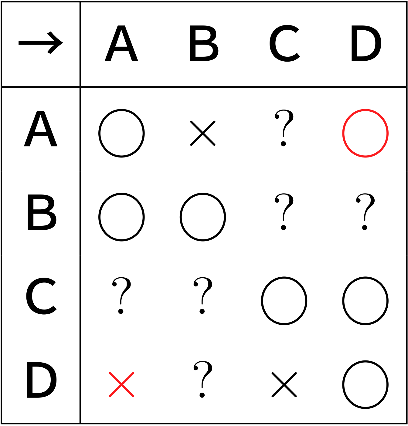 ※A→Dに○、D→Aに×を入れる。