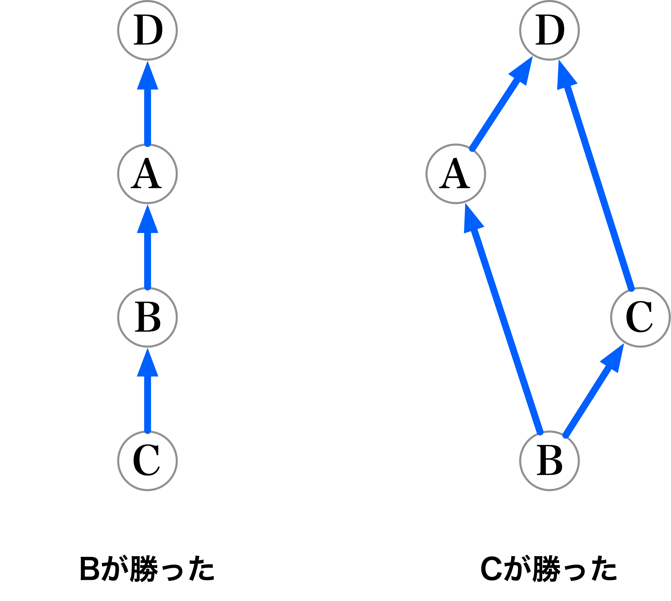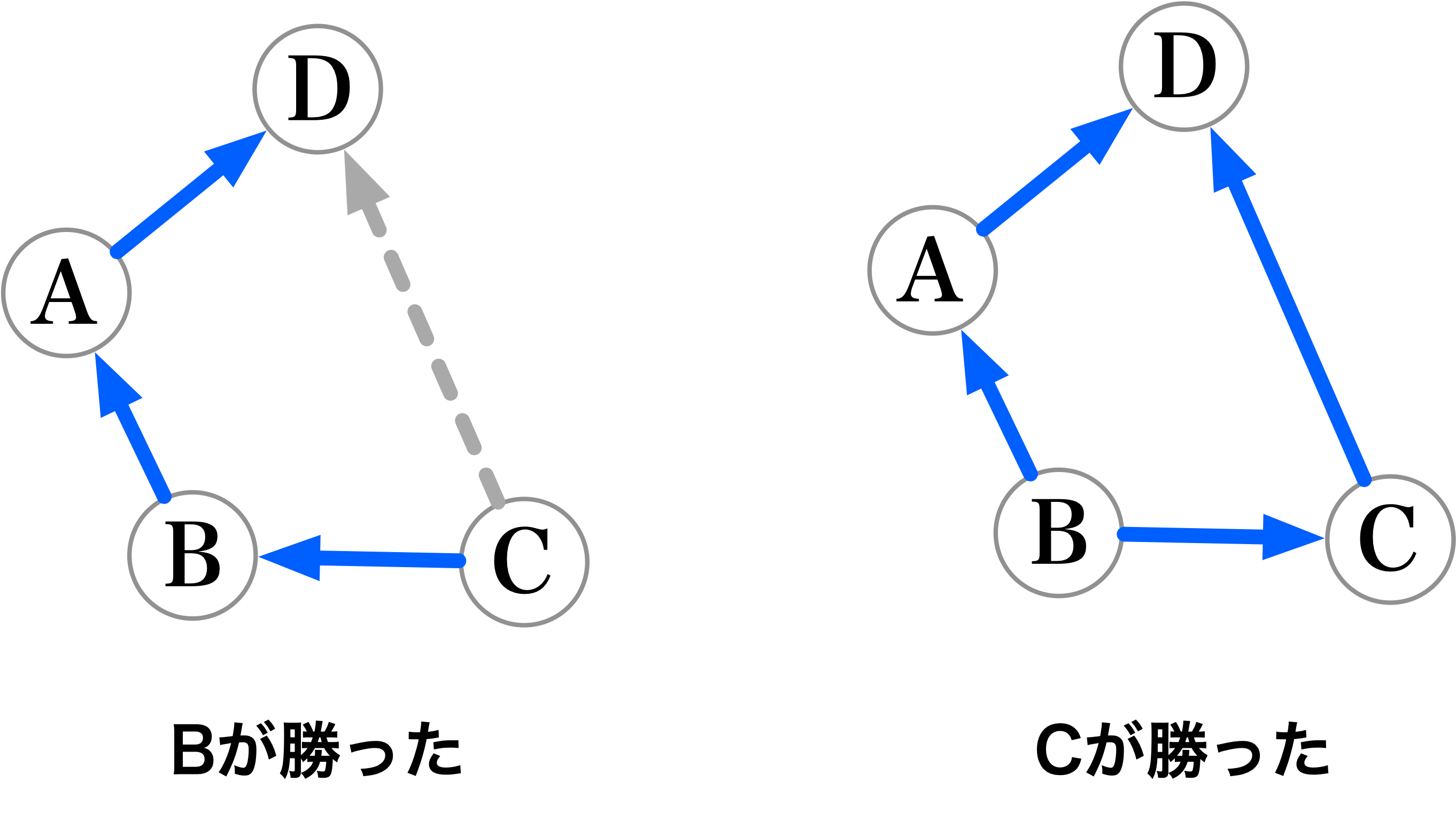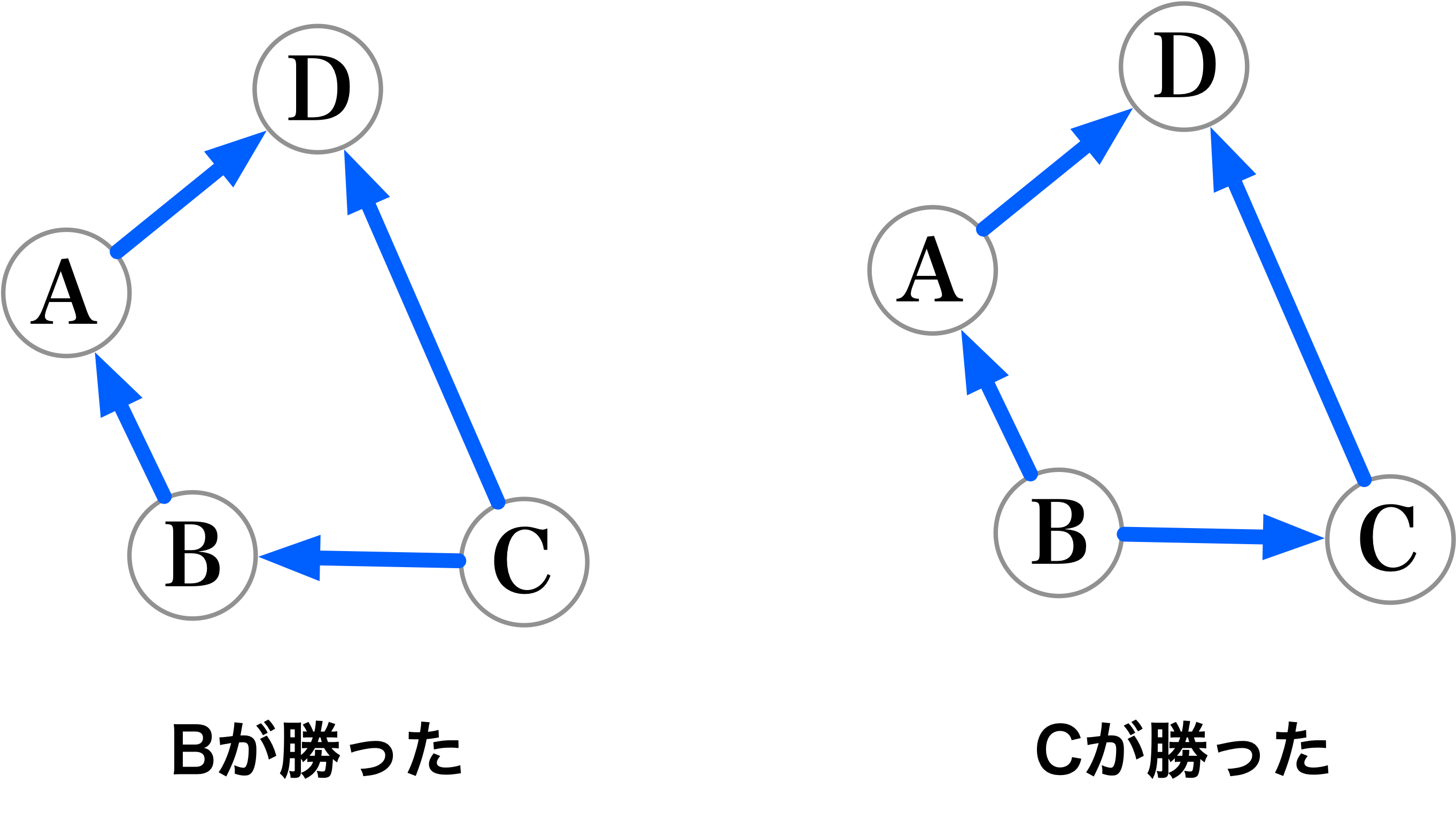 僕「このままだとそっくりだ。 そこで、Bが勝った左の図で、 推移律からわかる矢印を消してしまう。 つまりC→Dの矢印」