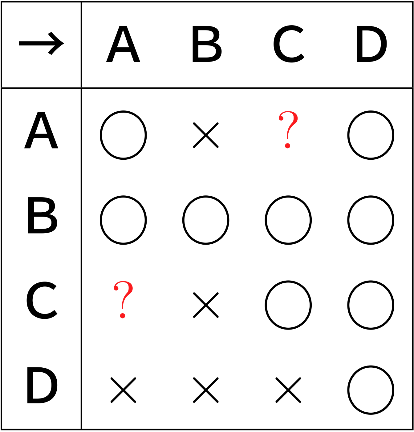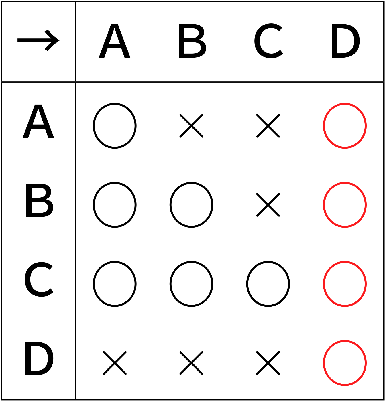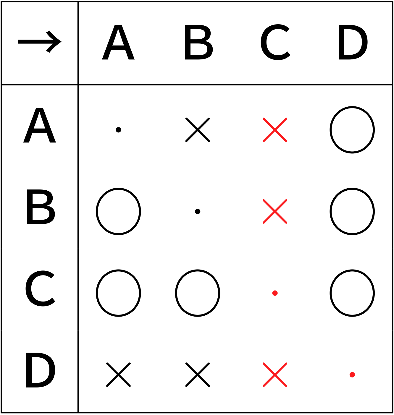 僕「そうだね。反射律を表すつもりでA→A, B→B, C→C, D→Dを入れたけど、 総当たり表が読みにくくなった。じゃあテン(・)で消しておこう。 そうすると、Cが最弱なのが、縦にバツが並ぶことで見てとれる」