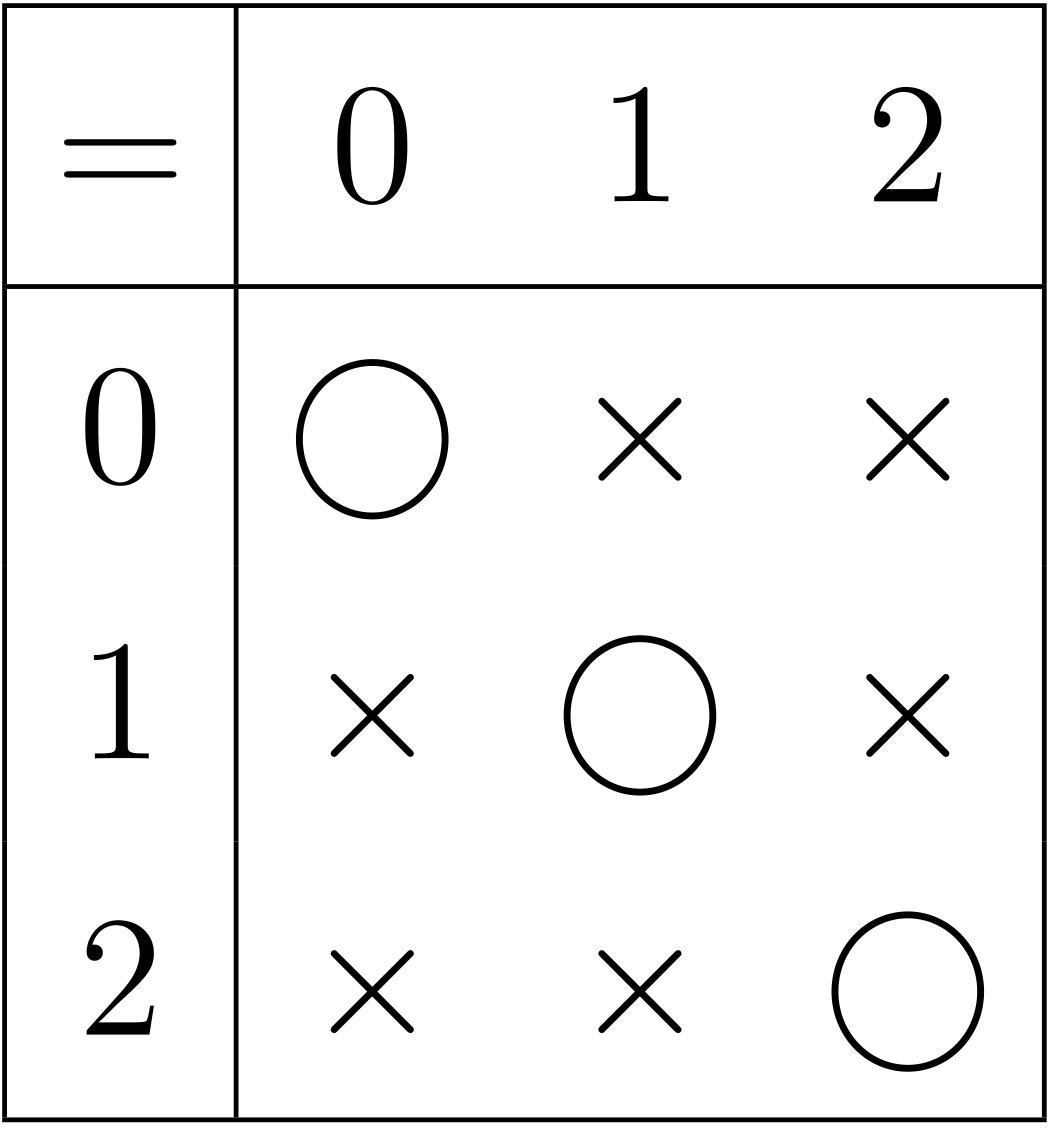 たとえば、《等しい($=$)》という《関係》は、 $$ \SET{(0,0),(1,1),(2,2)} $$ という《集合》で表せる。