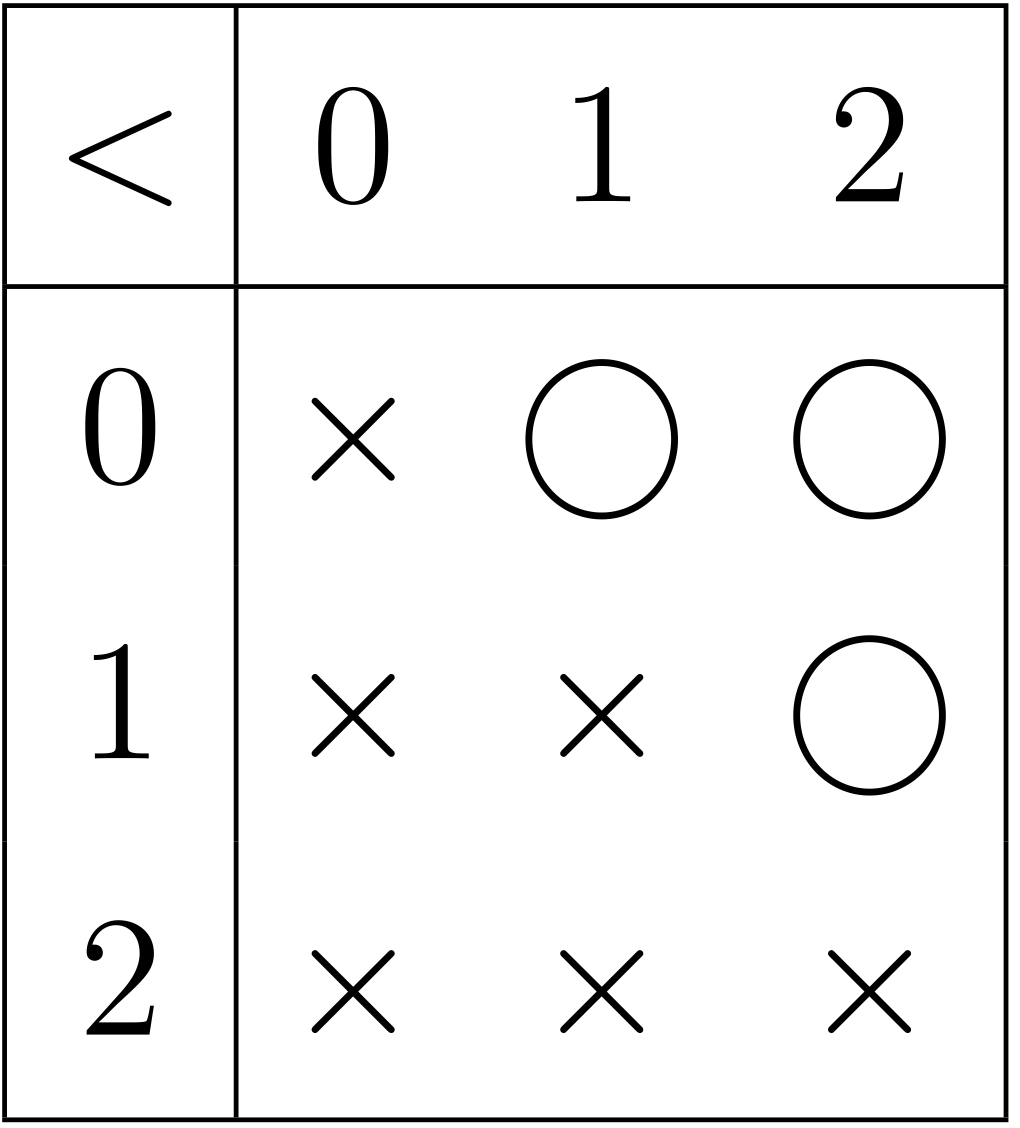 テトラ「はい。それでこの《関係》を表す《集合》を $J$ とすると、 $$ J = \SET{(0,1),(1,2),(2,0)} $$ になります。この $J$ と、 $R_=, R_<, R_\leqq$ との間には包含関係はなさそう……はい、 ありません」