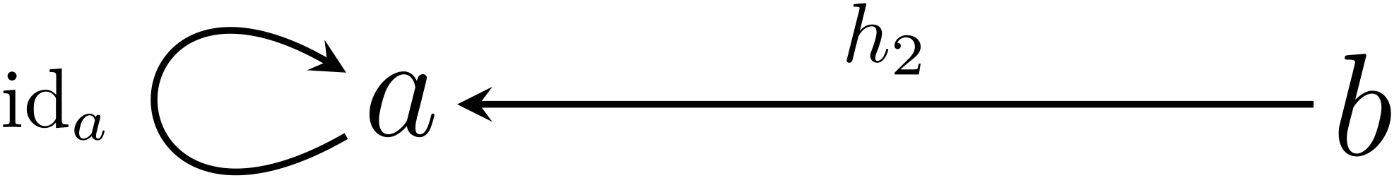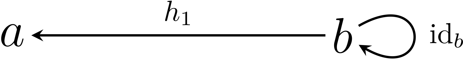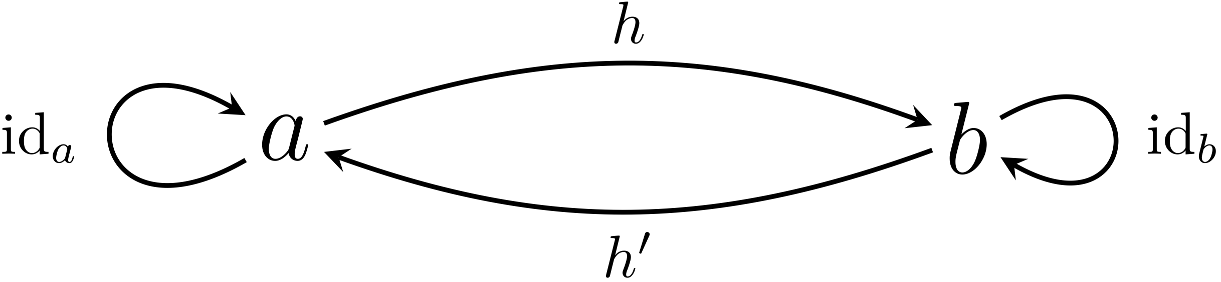 $$ \begin{xalignat*}{2} h'\circ h &= \ID{a} && \textrm{$\ID{a}$は$a$の恒等射} \\ h\circ h' &= \ID{b} && \textrm{$\ID{b}$は$b$の恒等射} \end{xalignat*} $$ミルカさんはテトラちゃんの説明に頷いた。