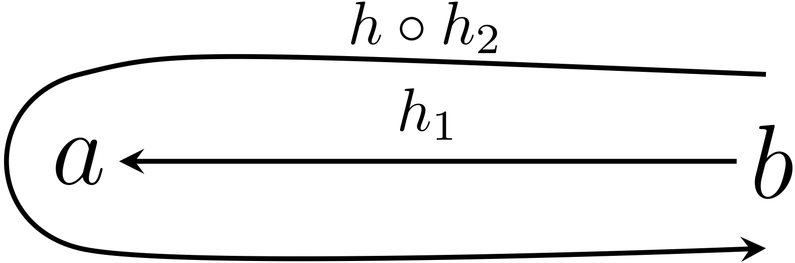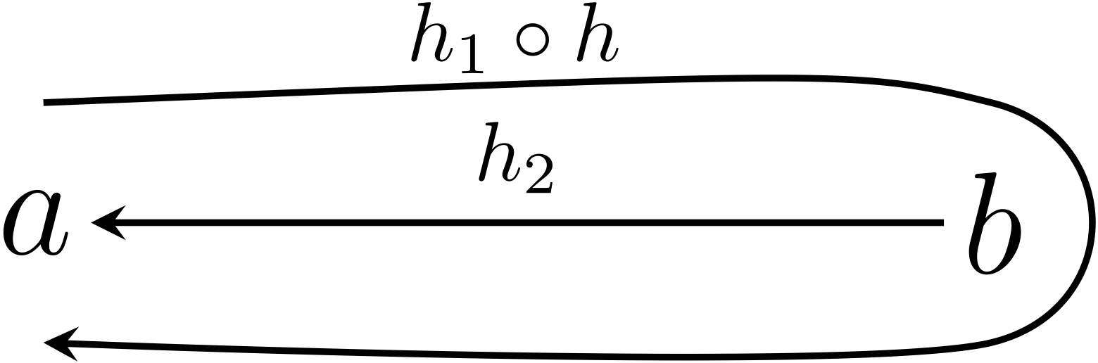 テトラ「なるほど……あたしは、 $h_1$ から $h_1\circ\MARKA{\ID{b}}$ を作るという発想ができませんでした。 さらに、その $\MARKA{\ID{b}}$ を $\MARKA{h\circ h_2}$ だと思うのも無理でした。 結合律でつなぎかえた後は 同じことを $h_2$ に向かって逆向きに進んでいけばいいのでわかります」